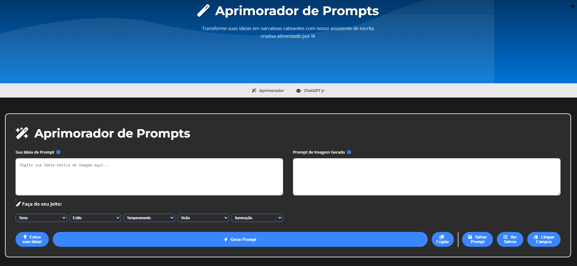 Com esta ferramenta, você insere uma palavra ou uma breve descrição da sua ideia, clica em "Aprimorar", e deixa a mágica acontecer! A inteligência artificial gera um prompt exato, perfeitamente ajustado, para que você crie imagens em qualquer gerador de imagens (como MidJourney, DALL-E, etc).